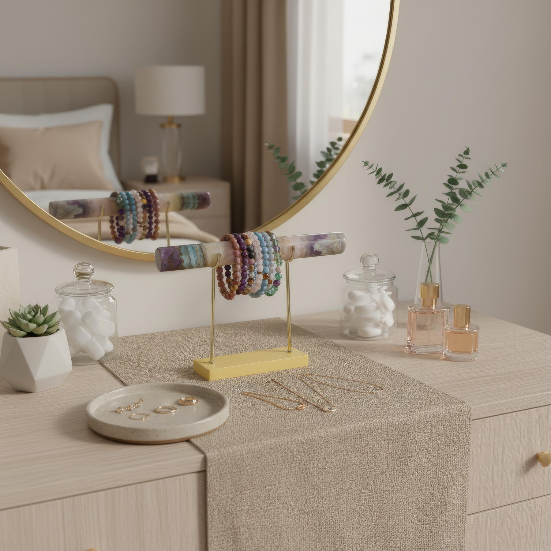 Your crystal jewelry is sacred—so why store it like it’s not? The Crystal Jewelry Holder is a stunning and functional energy tool that allows you to display with intention and cleanse with purpose. Each piece is carved from genuine crystal and features a removable crystal bar, so you can wrap your bracelets, necklaces, or malas around it for effortless daily clearing and charging.