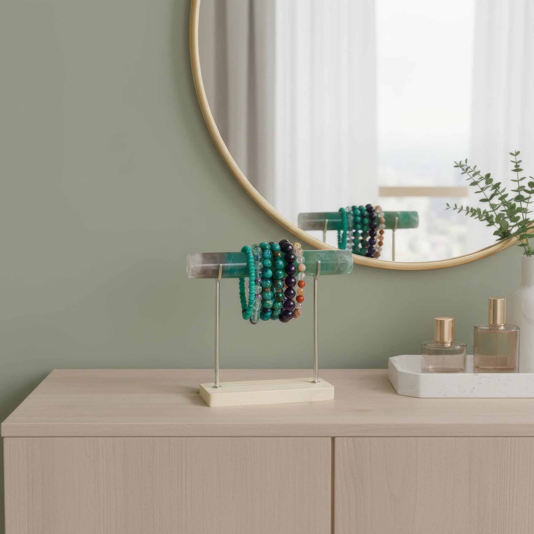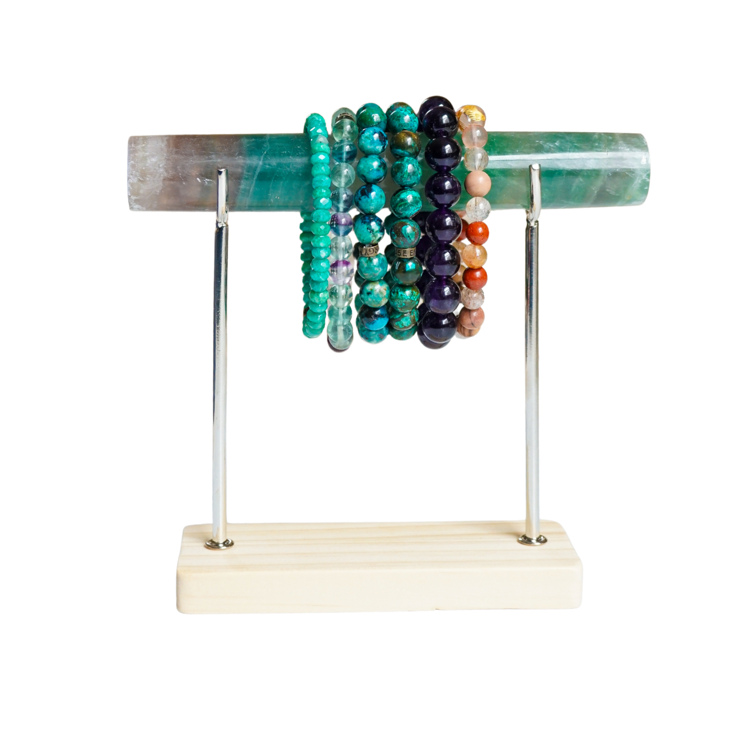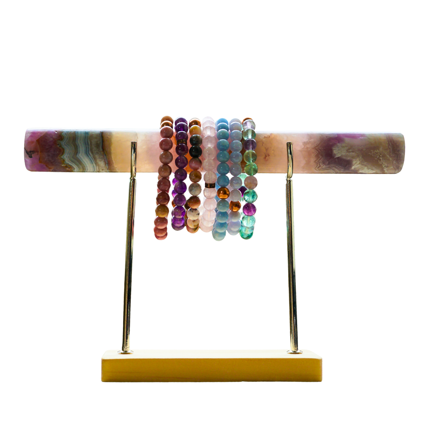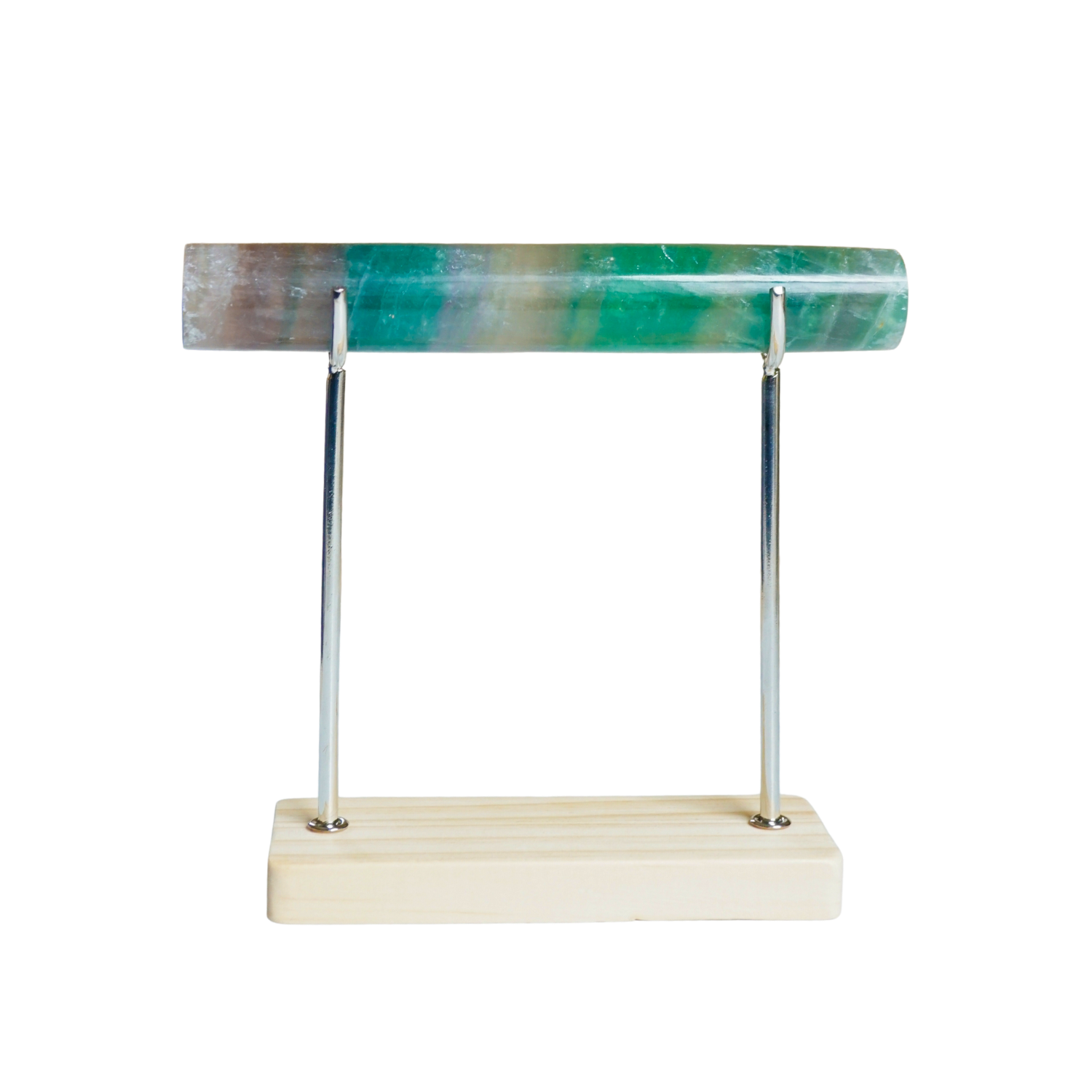 With layers of stabilizing Fluorite, this crystal bar supports mental clarity, energetic organization, and focused flow. Known for its ability to clear distraction and bring order to chaotic energy, Fluorite helps align thought, intention, and action. Its calming yet sharpening presence makes it ideal for holding jewelry that supports focus, decision-making, energetic balance, and clear-headed momentum.