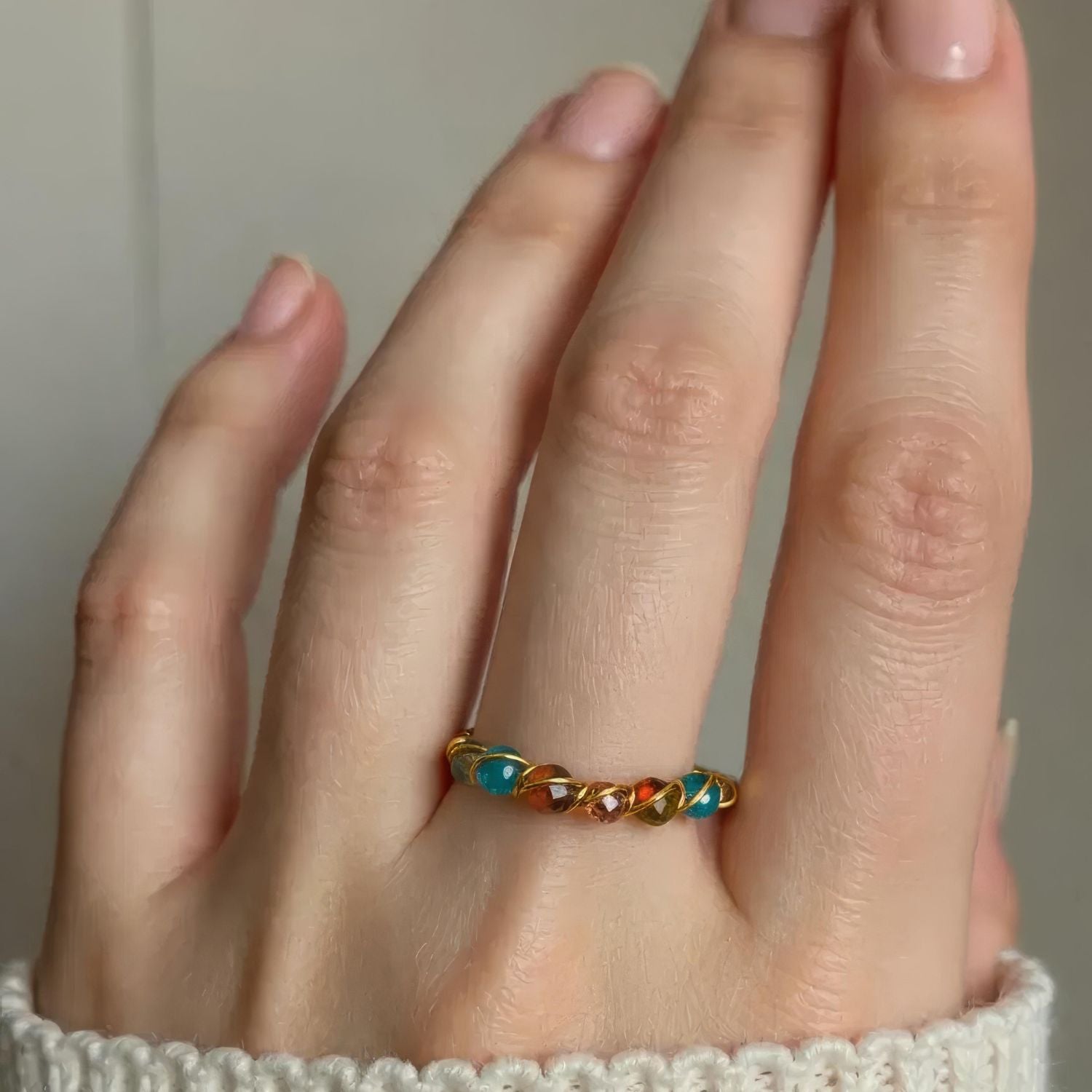 At the center of the ring is solid copper, a powerful conductor that amplifies frequency flow and supports circulation and energetic balance. Unakite works deeply with emotional regulation, helping release stored stress while gently stabilizing the heart space. Blue Apatite soothes mental tension and reduces overwhelm, while Aquamarine brings a cooling, calming energy that supports clear breathing and emotional ease.