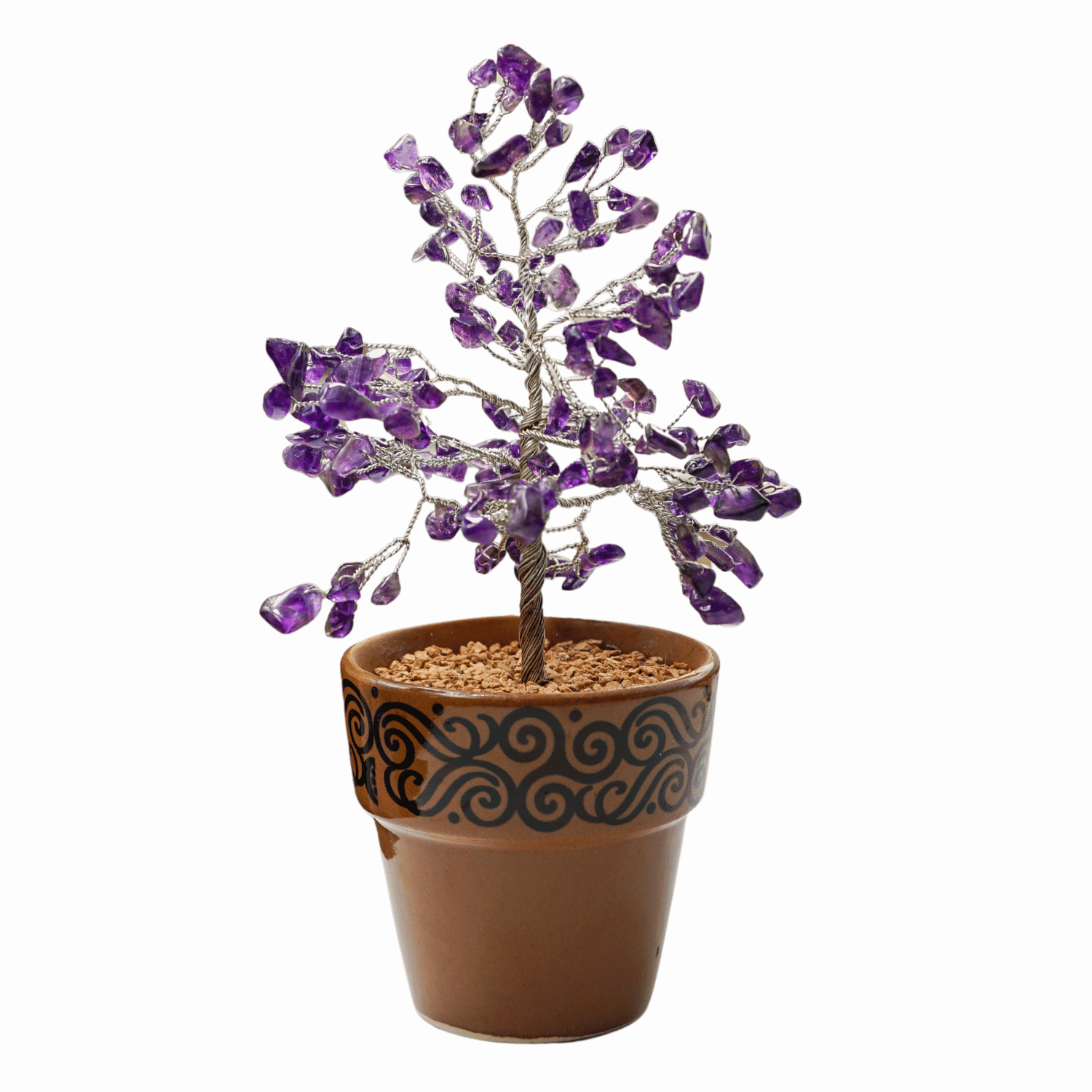 Welcome profound peace and spiritual elevation into your sanctuary with our captivating Amethyst Gem Tree, a mystical fusion of natural crystal energy and sacred symbolism. This artisan-crafted piece showcases genuine amethyst gemstone chips meticulously arranged on wire branches, forming a enchanting tree that radiates soothing purple hues and protective vibrations.