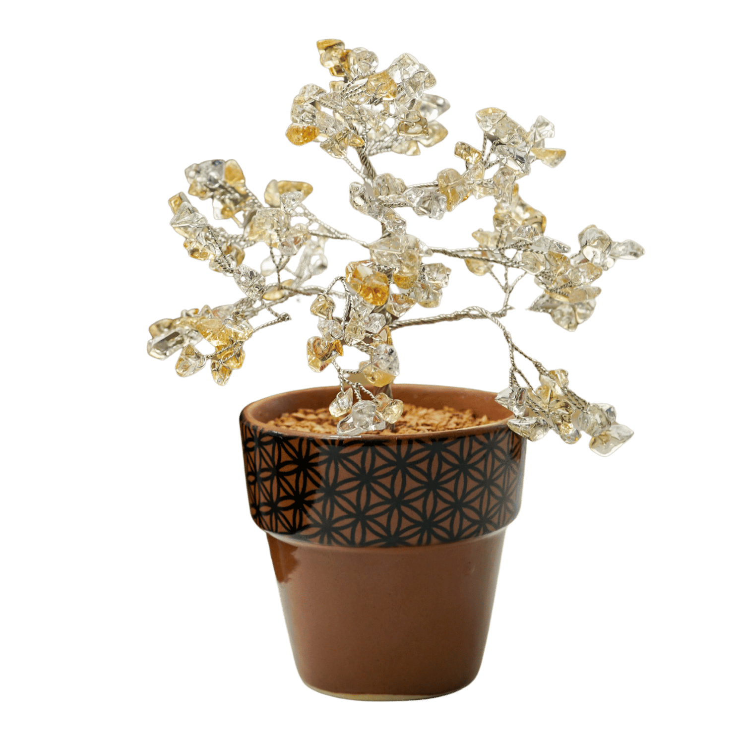 The tree is elegantly rooted in a high-quality ceramic pot featuring the Flower of Life, one of the most powerful symbols in sacred geometry. This ancient pattern represents the interconnectedness of all life and the fundamental forms of space and time. The combination of citrine's manifestation properties with the Flower of Life's creative energy creates a powerful tool for intention-setting and spiritual growth.