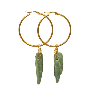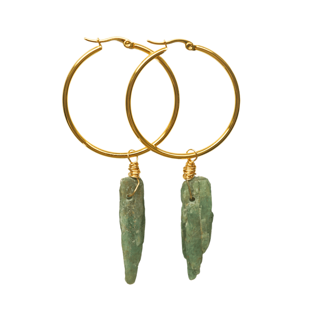 Each earring features a raw, natural Green Kyanite crystal, hand-wrapped onto a gold-plated hoop. The unique structure and color of Green Kyanite infuse these earrings with fresh, revitalizing energy that’s instantly grounding and uplifting. As you wear them, the stone’s frequencies travel from your ears through your whole being—reminding you to align your actions with your heart’s wisdom and stay true to yourself in every moment.