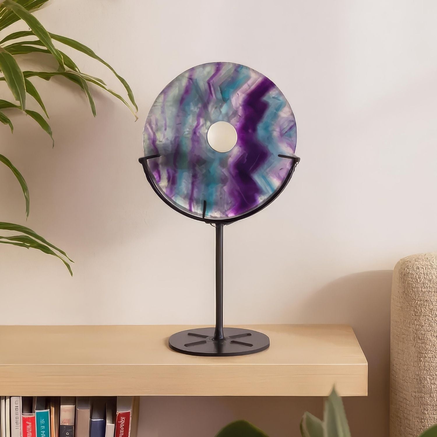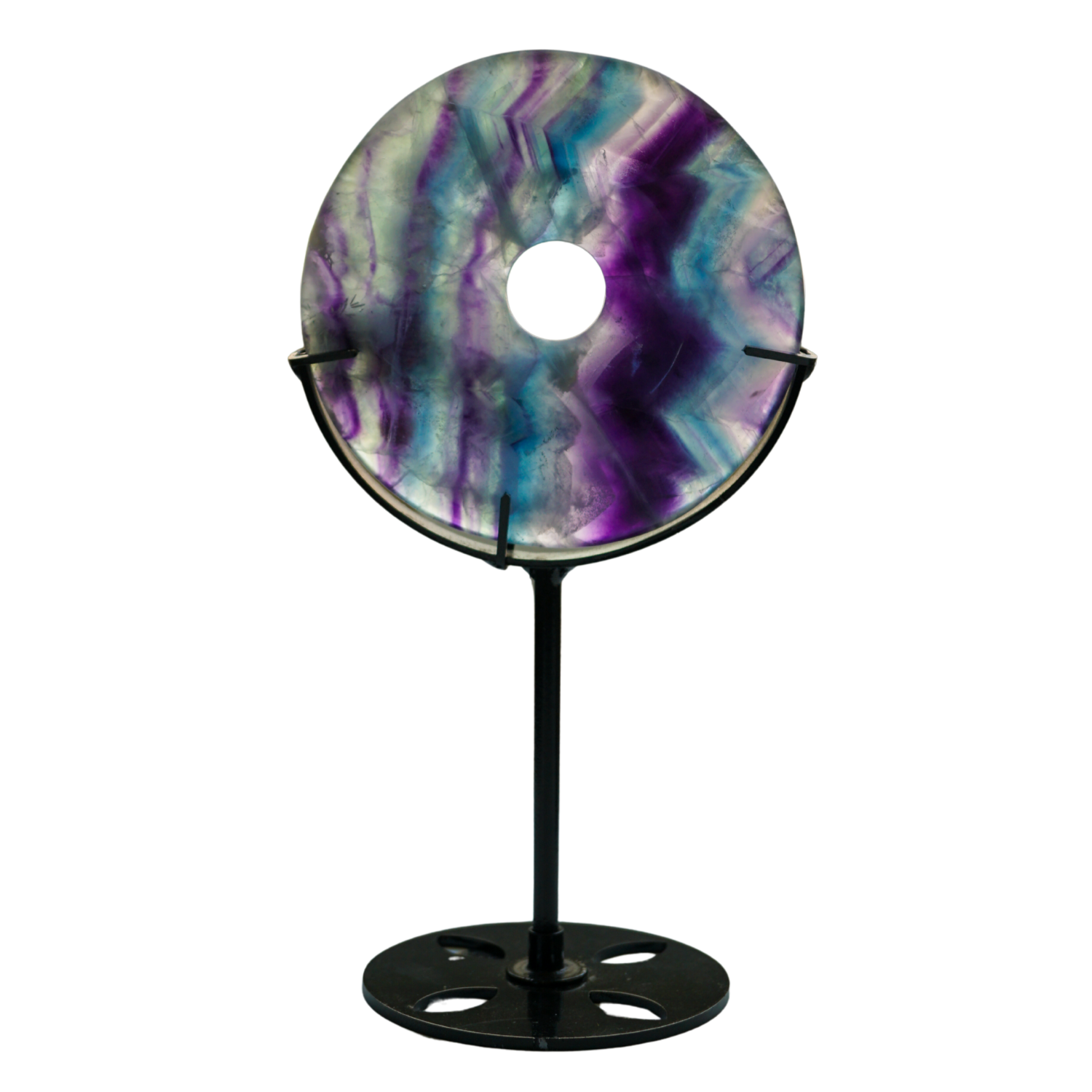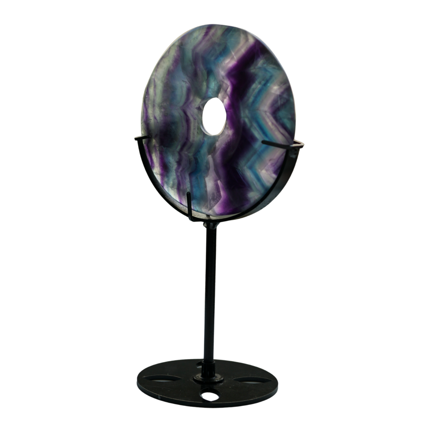 This piece features a large Fluorite donut carving, elevated on a stand so its energy can radiate freely throughout your space. Fluorite works by clearing mental fog, neutralizing electromagnetic stress, and creating a calm, coherent field—making it especially powerful for homes, offices, creative studios, and shared living spaces.
