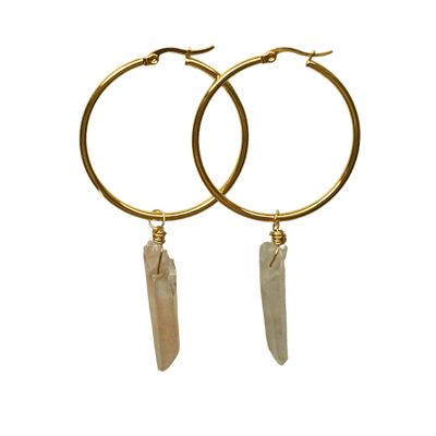 Pink Lemurian crystals are all about unconditional love, emotional healing, and heart-based wisdom. Our Pink Lemurian Hoop Earrings are crafted for anyone seeking to deepen self-love, heal from the past, or attract new joy into their lives. Each earring features a raw Pink Lemurian crystal, hand-wrapped and suspended from a luminous gold-plated hoop.