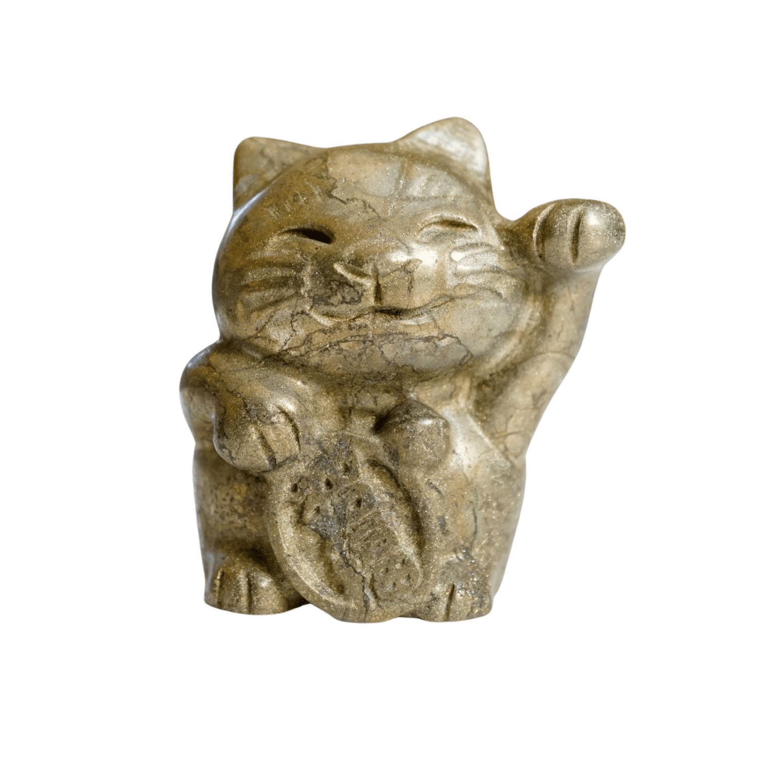 The Pyrite Lucky Cat merges two of the most powerful prosperity symbols into one intentional piece. Carved from genuine Pyrite — long known as a stone of wealth, confidence, and financial protection — and shaped into the traditional Maneki Neko (beckoning cat), this piece becomes a magnet for opportunity and abundance.
