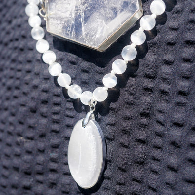 Crafted entirely from Selenite, one of the highest-frequency crystals on Earth, this pendant necklace radiates light in every direction. There are no other stones here, no distractions. Just pure, uninterrupted frequency—designed to hold you steady as you rise into clarity, consciousness, and cosmic alignment.
