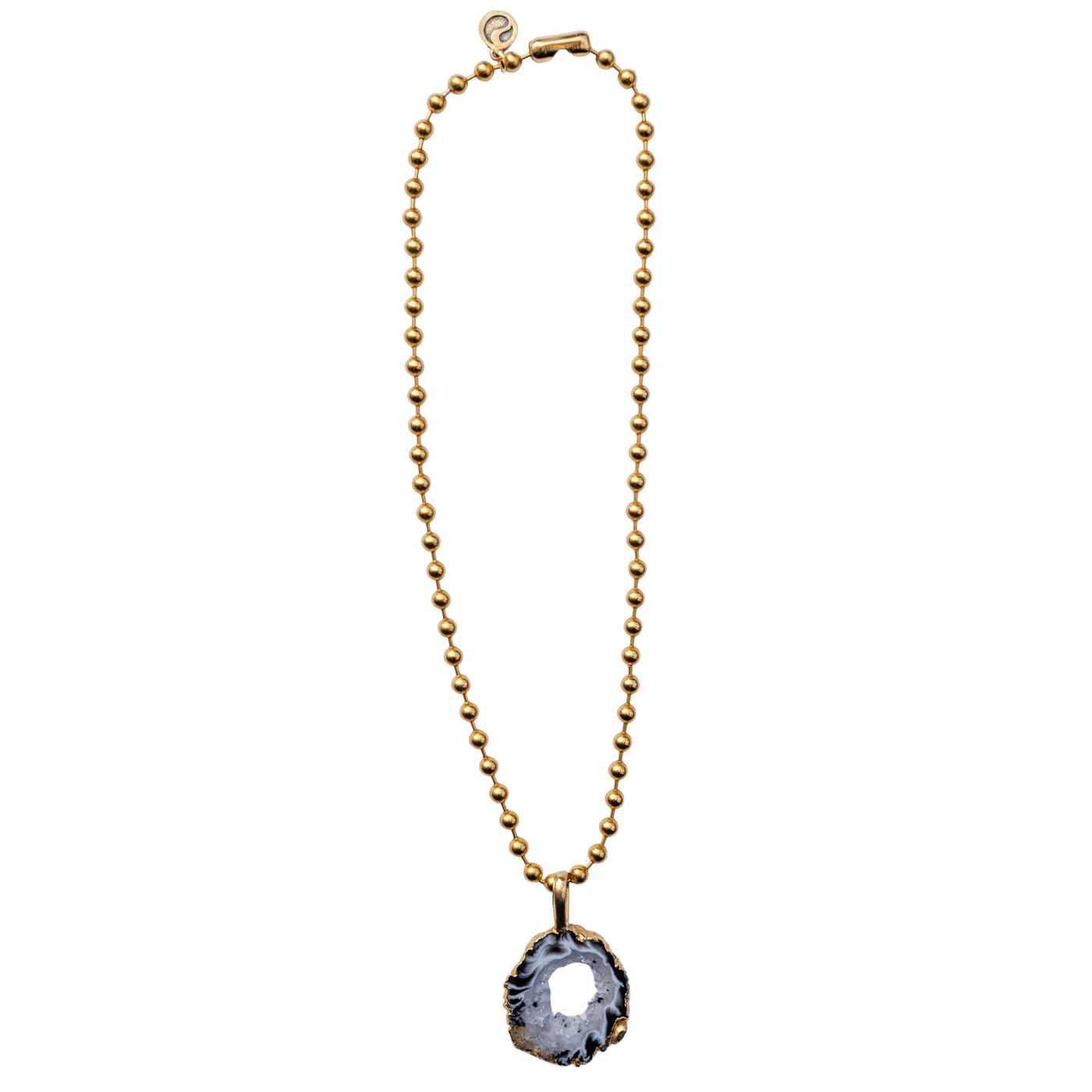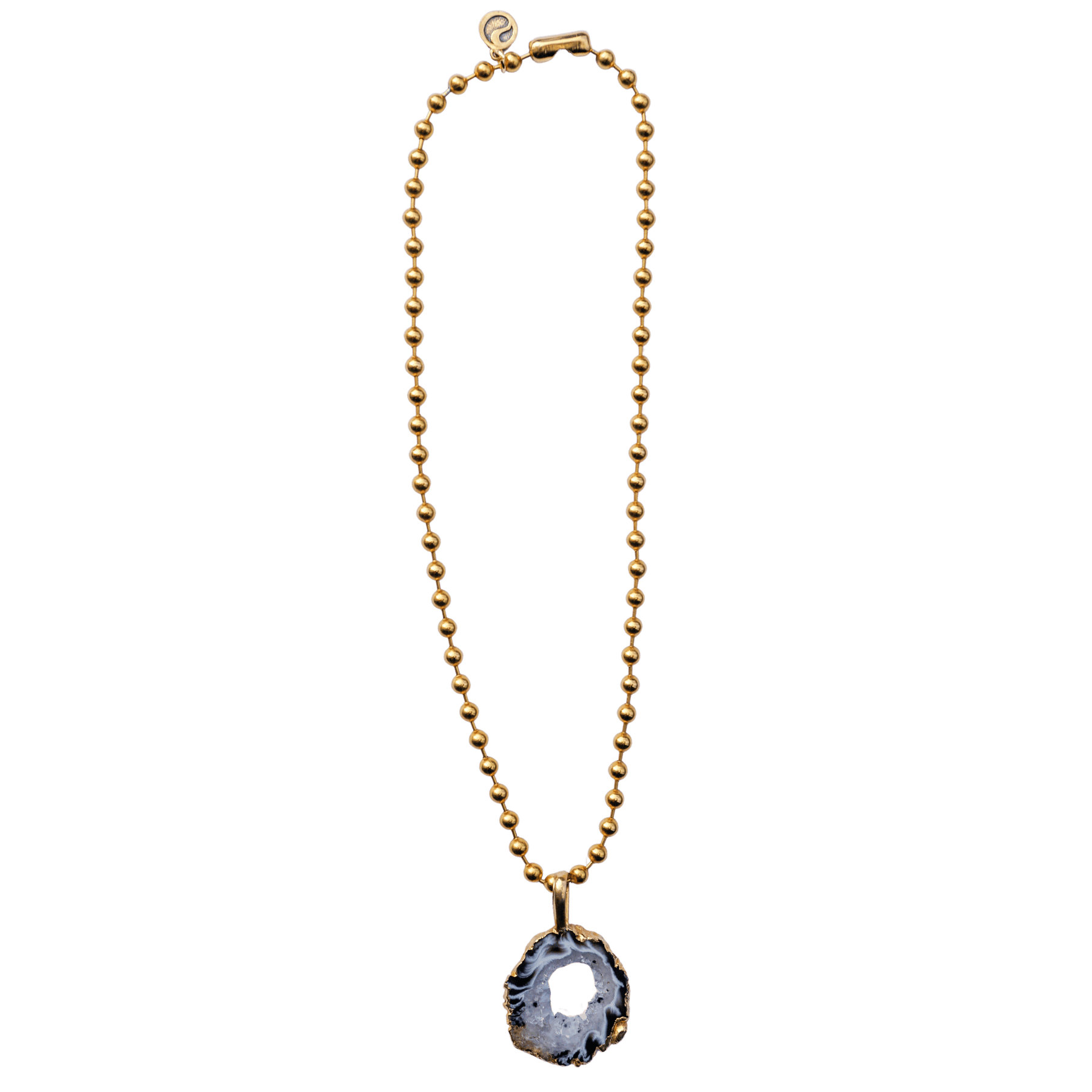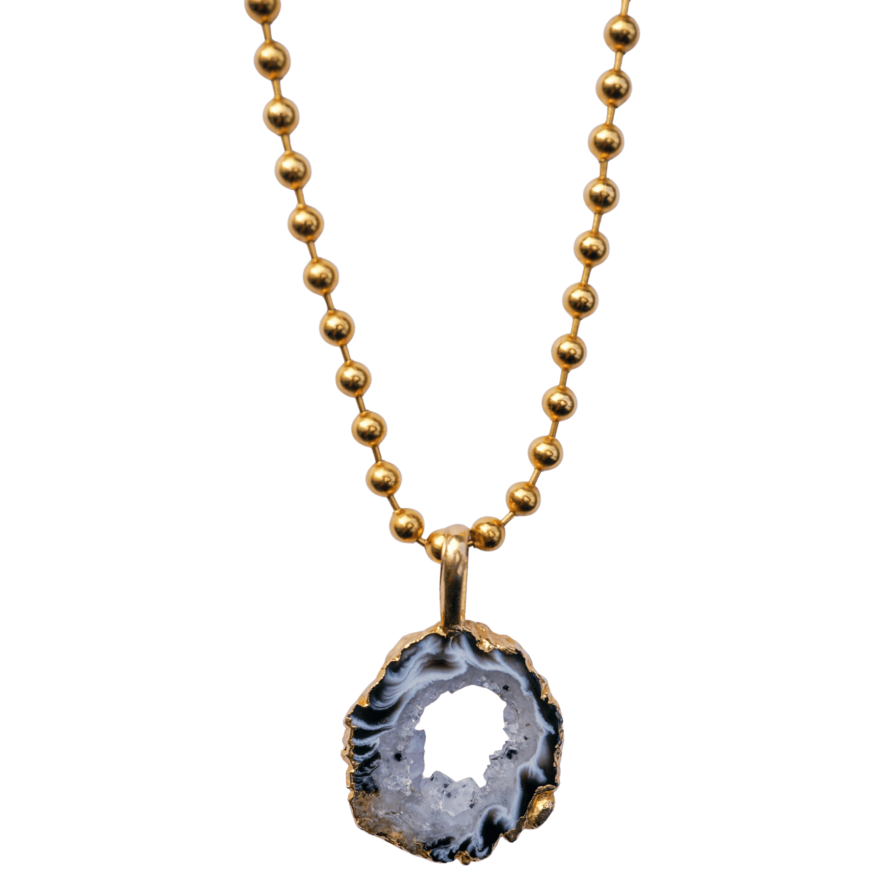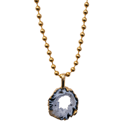 This stunning agate geode is nature’s reminder that beauty begins within. Agate is a grounding stone that supports emotional stability, inner strength, and a calm mind—while the geode formation amplifies that energy with layers of protection and quiet wisdom. Paired with gold ball chain, this piece encourages confident expression and spiritual glow. No two geodes are alike, and neither is your path—wear this when you want your style to reflect your soul.