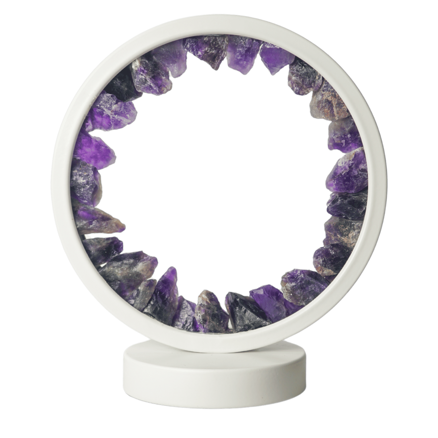 Amethyst has long been revered as a stone of spiritual protection, intuition, and emotional balance. It works gently but powerfully to calm the mind, soothe emotional turbulence, and open the door to higher wisdom. In this design, countless raw Amethyst stones are arranged in a luminous halo that doesn’t just sit in your space—it broadcasts healing energy outward, creating a sacred atmosphere of clarity and peace.