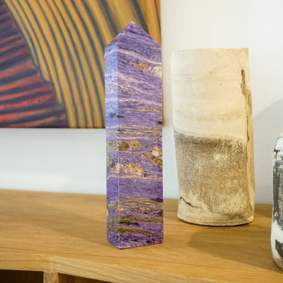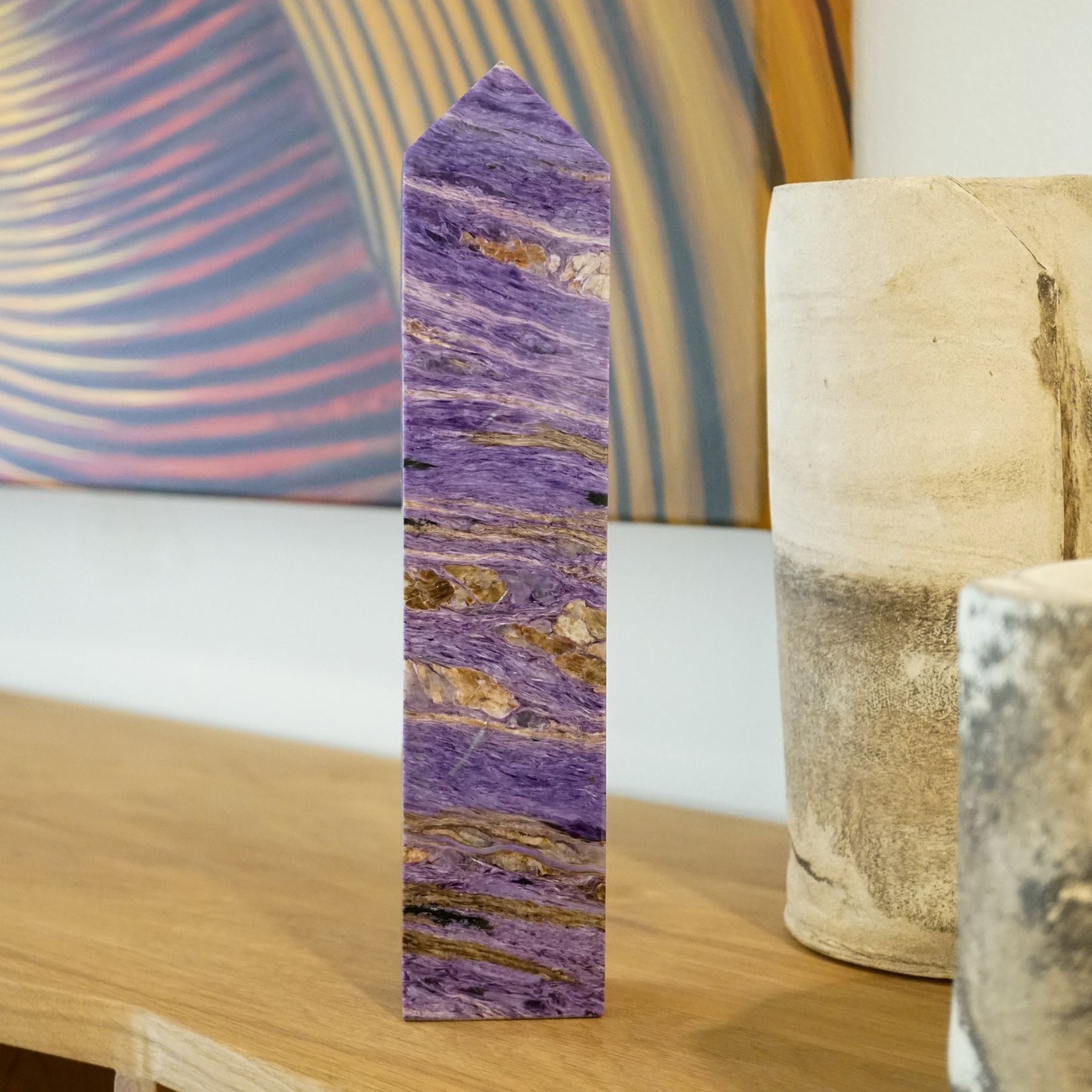 Charoite is the stone of spiritual alchemy—and this tower was hand-selected for its violet swirls and rich energetic pull. It transmutes fear into courage, chaos into clarity, and disconnection into purpose. Use it to move through change with power and grace. This is a crystal for the soul-led, ready to rise.
