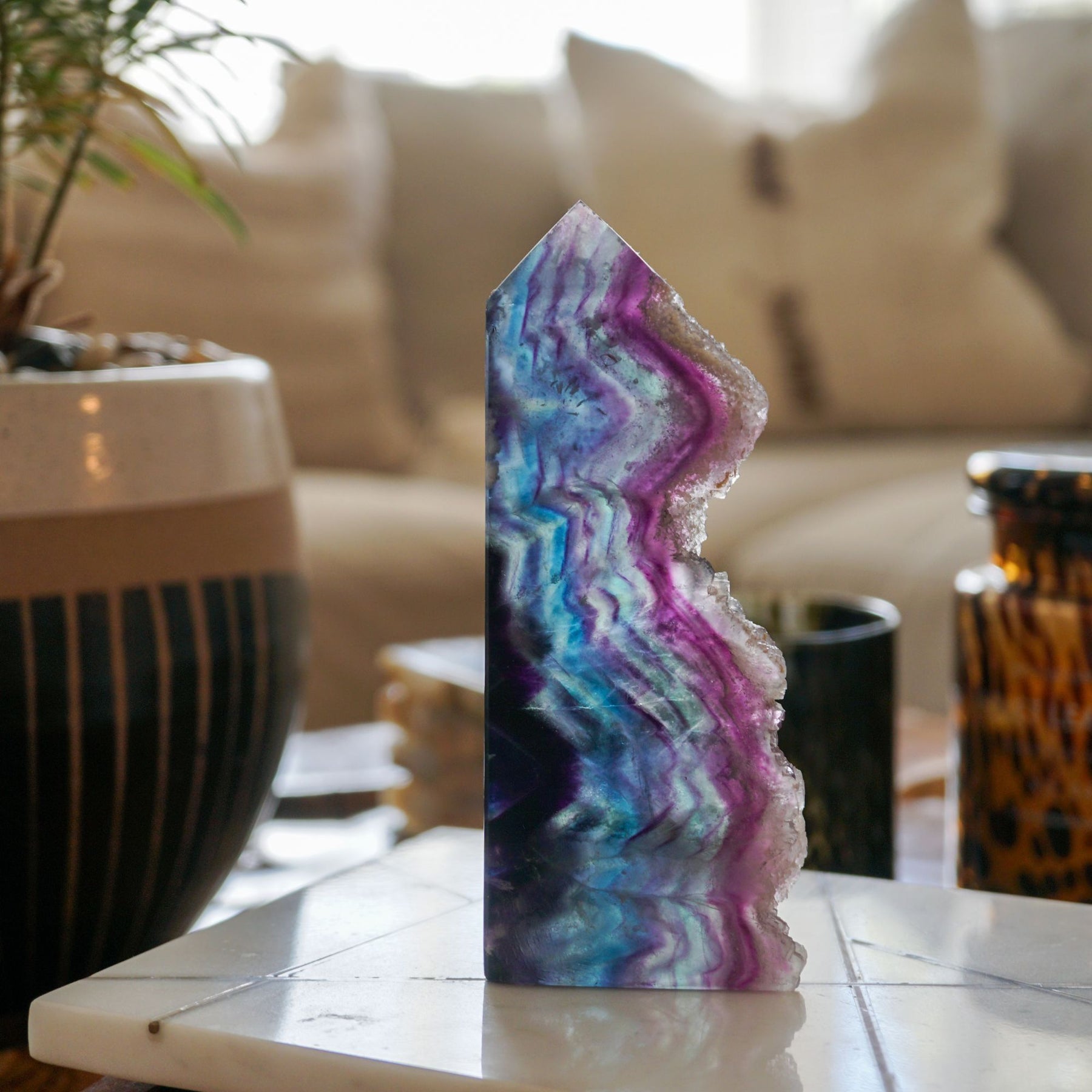 Each Fluorite Geode Point is a prism of energetic intelligence, combining protective power with radiant calm. Naturally formed and geode-cut to reveal its inner crystalline matrix, this piece doesn’t just sit pretty—it functions as a spiritual stabilizer and signal tuner.