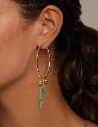 Our Green Kyanite Angel Wing Hoop Earrings are more than a statement piece—they’re an energetic talisman for anyone craving divine guidance, heartfelt clarity, and soul-level alignment. Each gold-plated hoop features a hand-selected, raw Green Kyanite crystal—carefully wire-wrapped and crowned with a gold angel wing charm for that extra touch of magic and meaning.