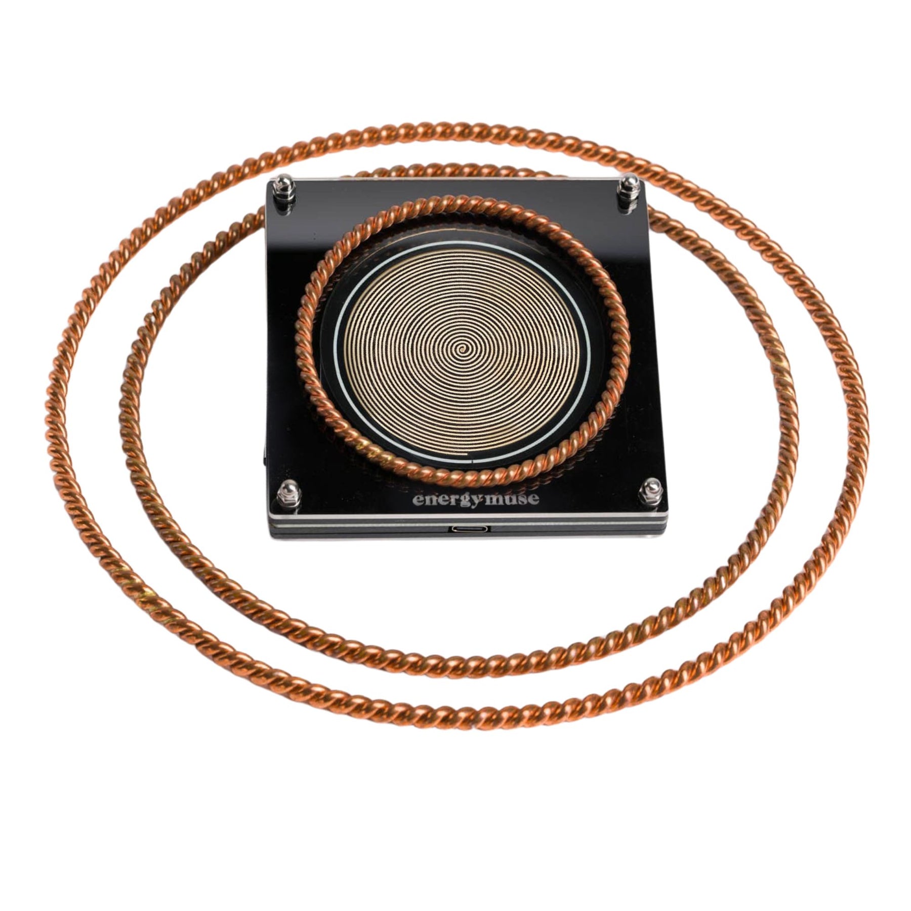 A Tensor Ring is created by twisting copper wires into a loop and welding the ends together. This forms a toroidal field that produces a continuous, focused flow of energy.