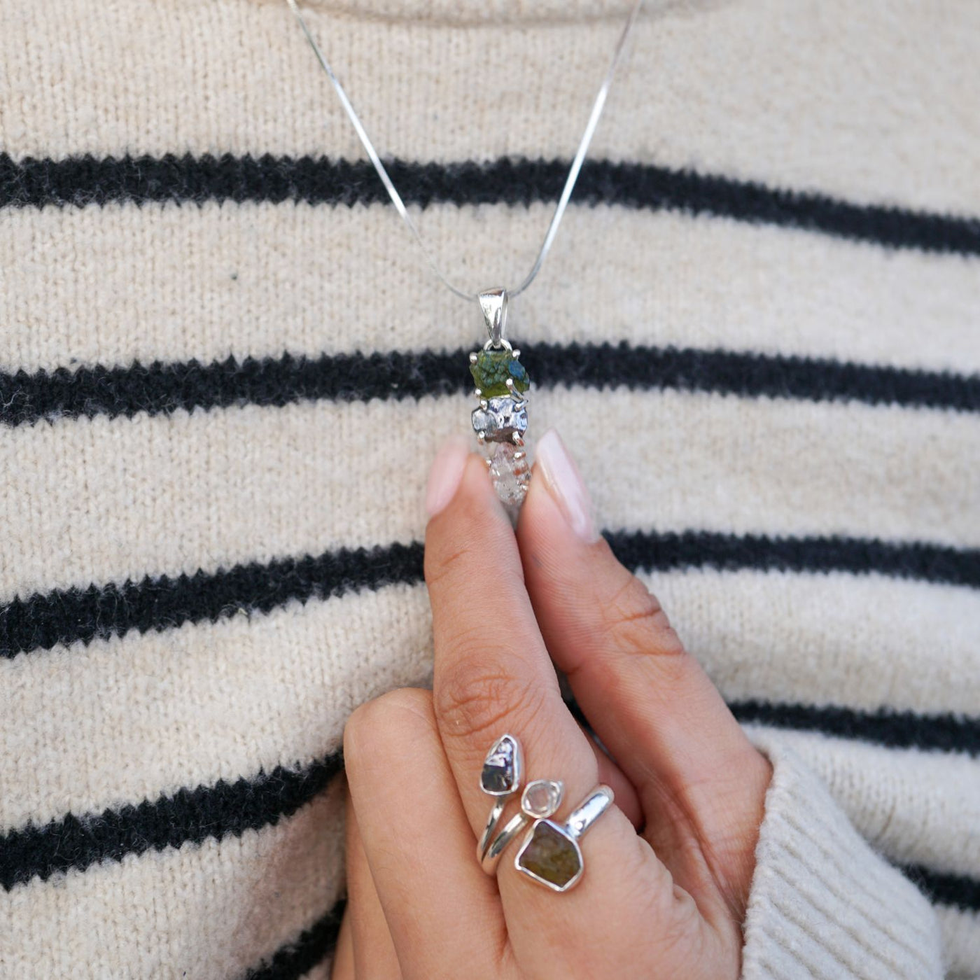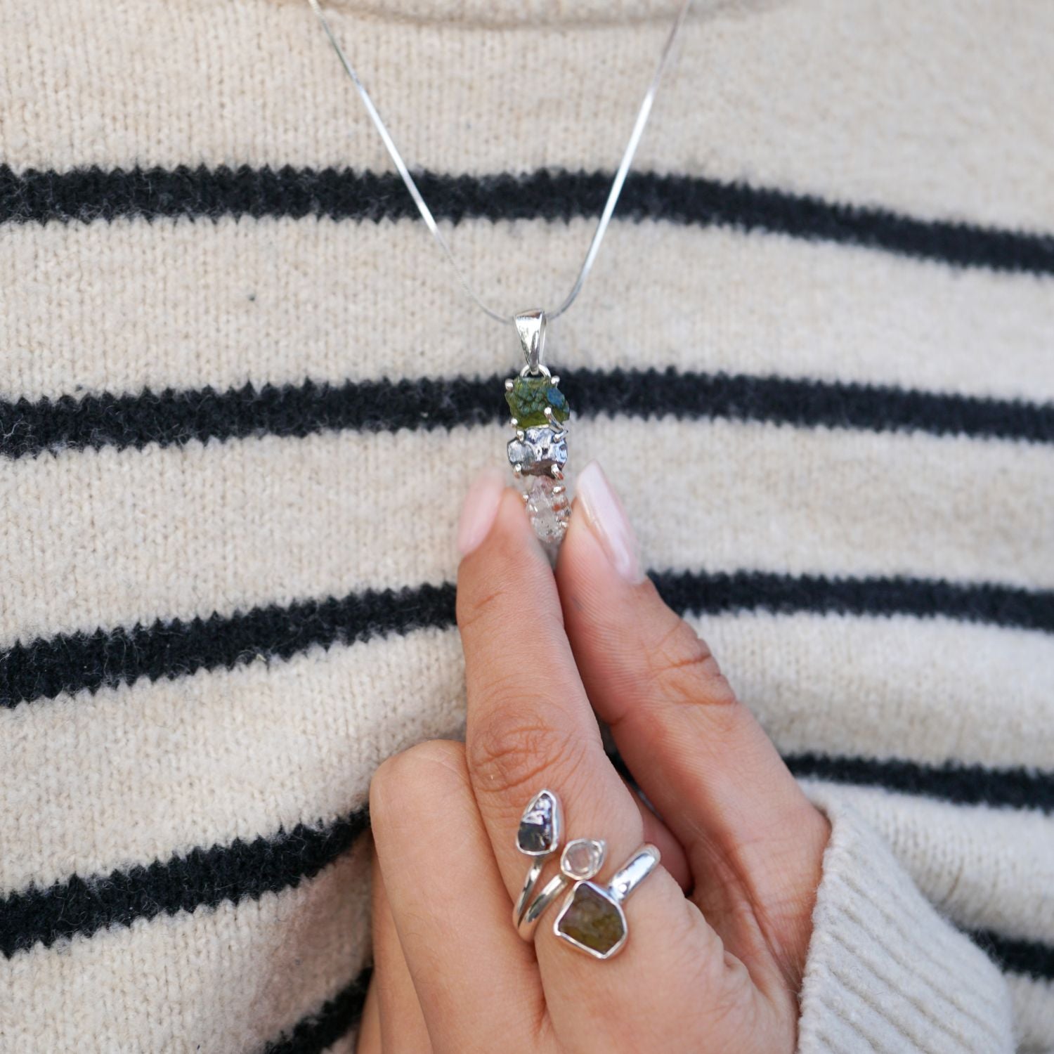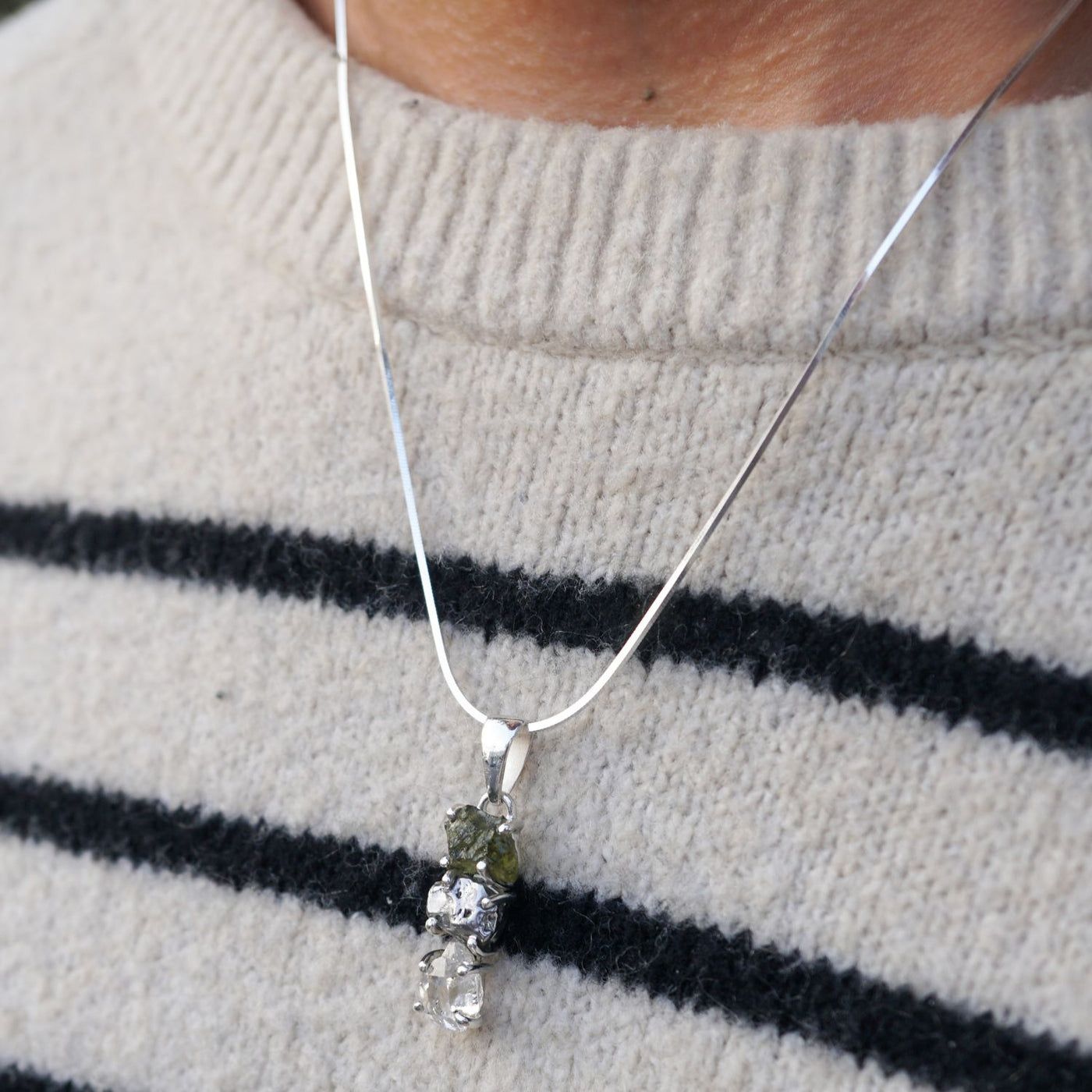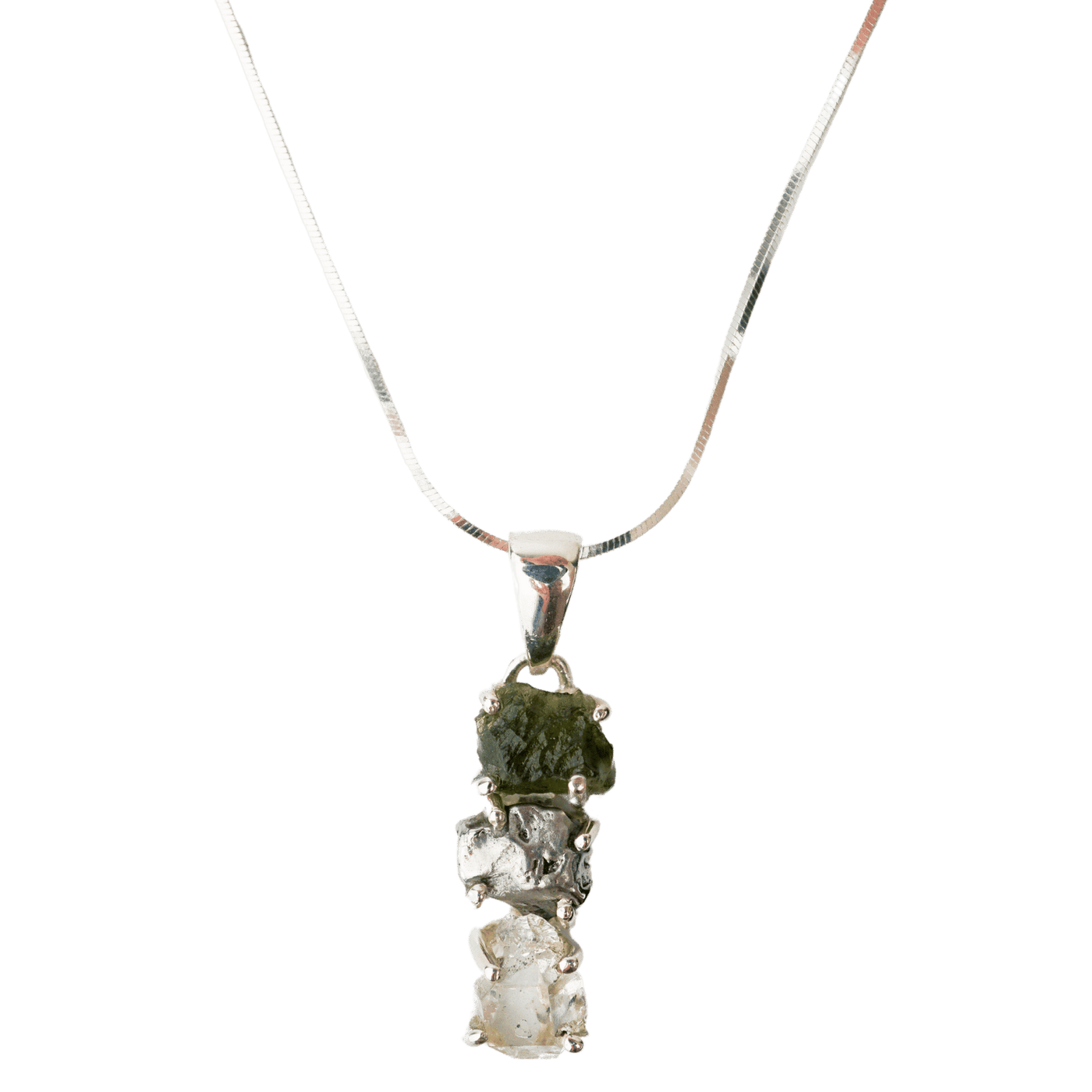 Set in high-quality sterling silver, this necklace acts as a conduit for the powerful frequencies of these cosmic stones. Silver enhances energetic flow and magnifies the properties of the stones, allowing you to experience their full potential.