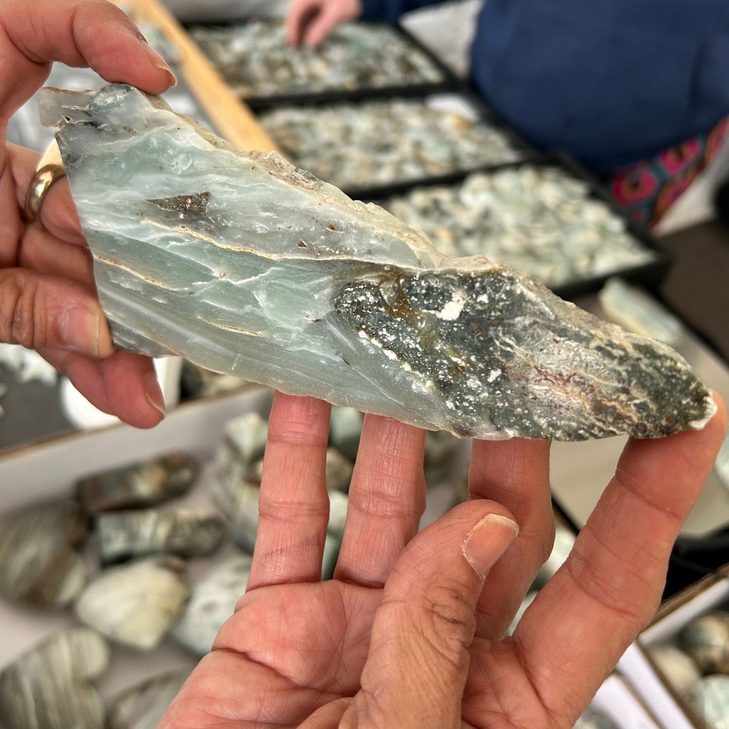 The Ocean Picture Stone Slab is like nothing we’ve ever found before—nature’s own painting, complete with waves, sand, sky, and movement. These slabs were hand-harvested in British Columbia by Dan Hurd, a legendary prospector whose finds are usually only available through his personal collection. We were lucky enough to discover a small batch at the Tucson Gem Show—and we knew immediately that we had to bring them home.