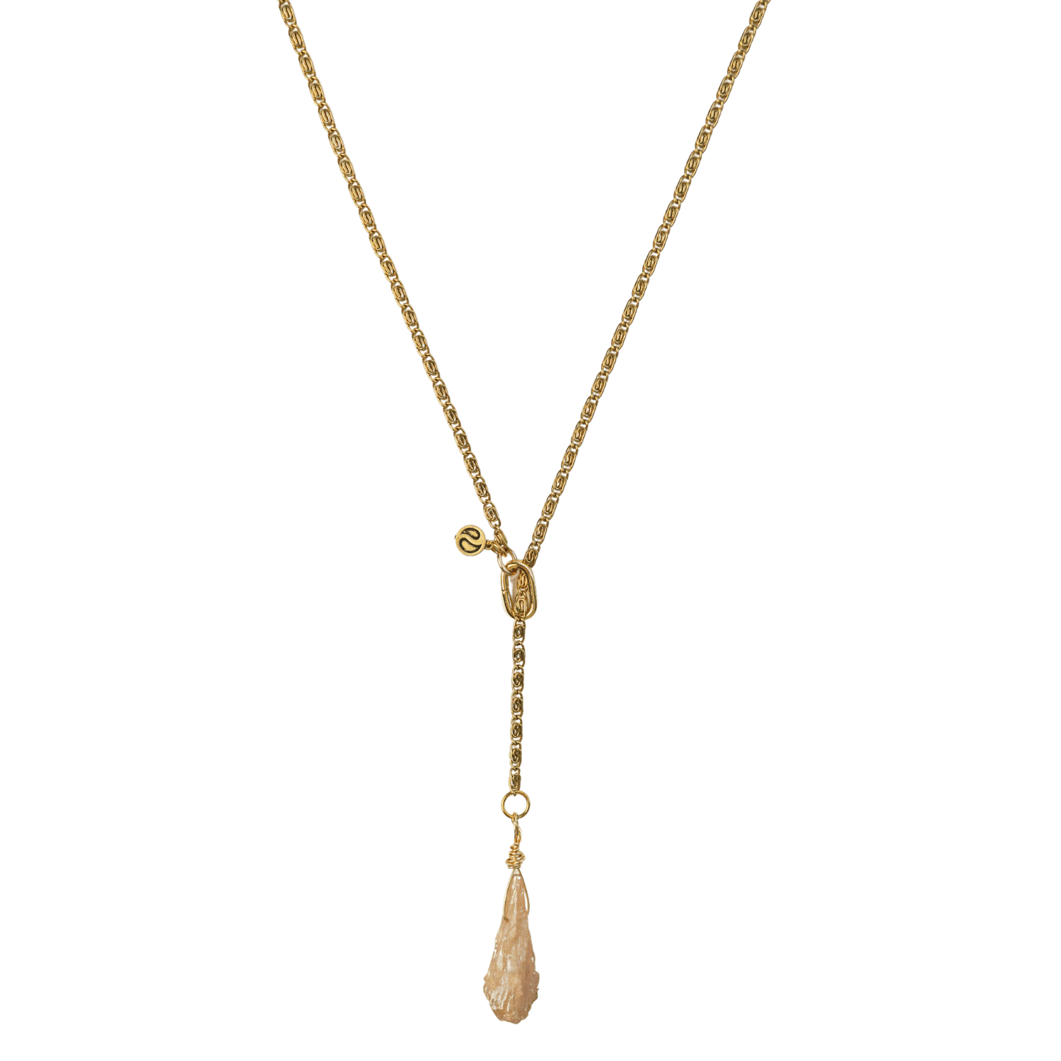 This raw-cut crystal was paired with a luminous gold chain—selected to elevate its sunny vibration. Like all pieces in our Aligned Adornments collection, it was intuitively designed by listening to the crystal’s frequency and letting that guide every decision.