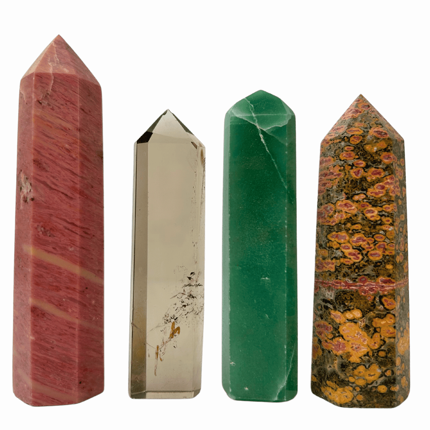Embrace healing and balance with Points Collection #4, featuring four distinct crystals: Rhodonite, Aventurine, Smoky Quartz, and Leopard Skin Jasper. Each crystal brings its own unique energy to support emotional healing, growth, and protection: