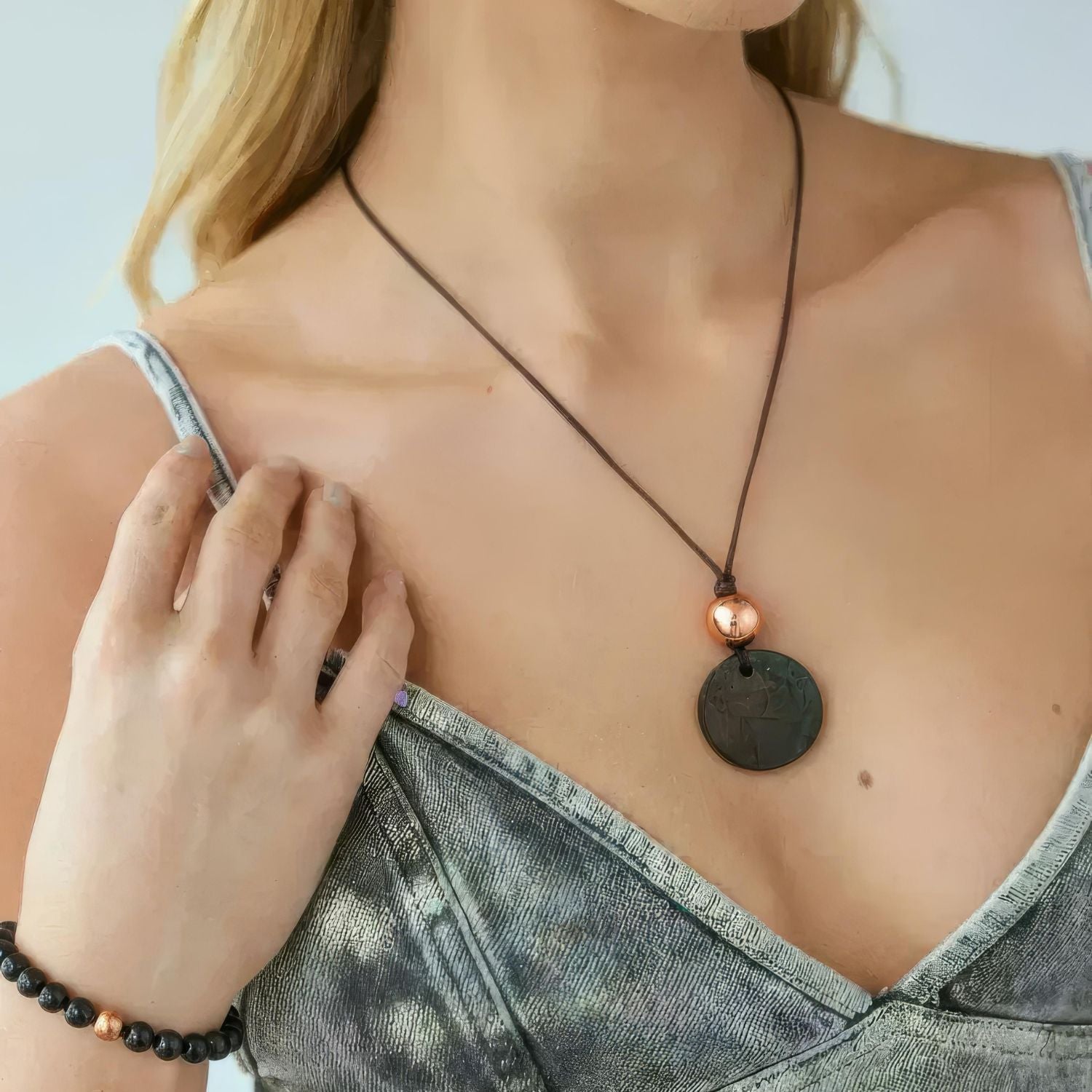 The design is intentionally minimal: a dark, earthy Shungite pendant accented by warm, reflective Copper on a simple adjustable cord. It sits close to the heart and solar plexus, two energy centers that hold stress, boundaries, and personal power. Whether you're navigating back-to-back meetings, crowded spaces, or just the weight of a long to-do list, this piece reminds your system to downshift and come home to itself.