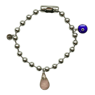 Silver Charm Bracelet with Rose Quartz & Blue Evil Eye