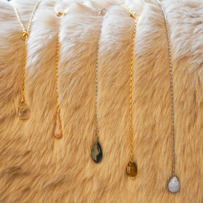 This faceted drop pendant was paired with a warm gold chain—chosen for its frequency match to the crystal’s vibrant, earthy energy. The lariat style allows the stone to rest and move around key energy centers, adapting to your own vibration as you shift throughout the day.
