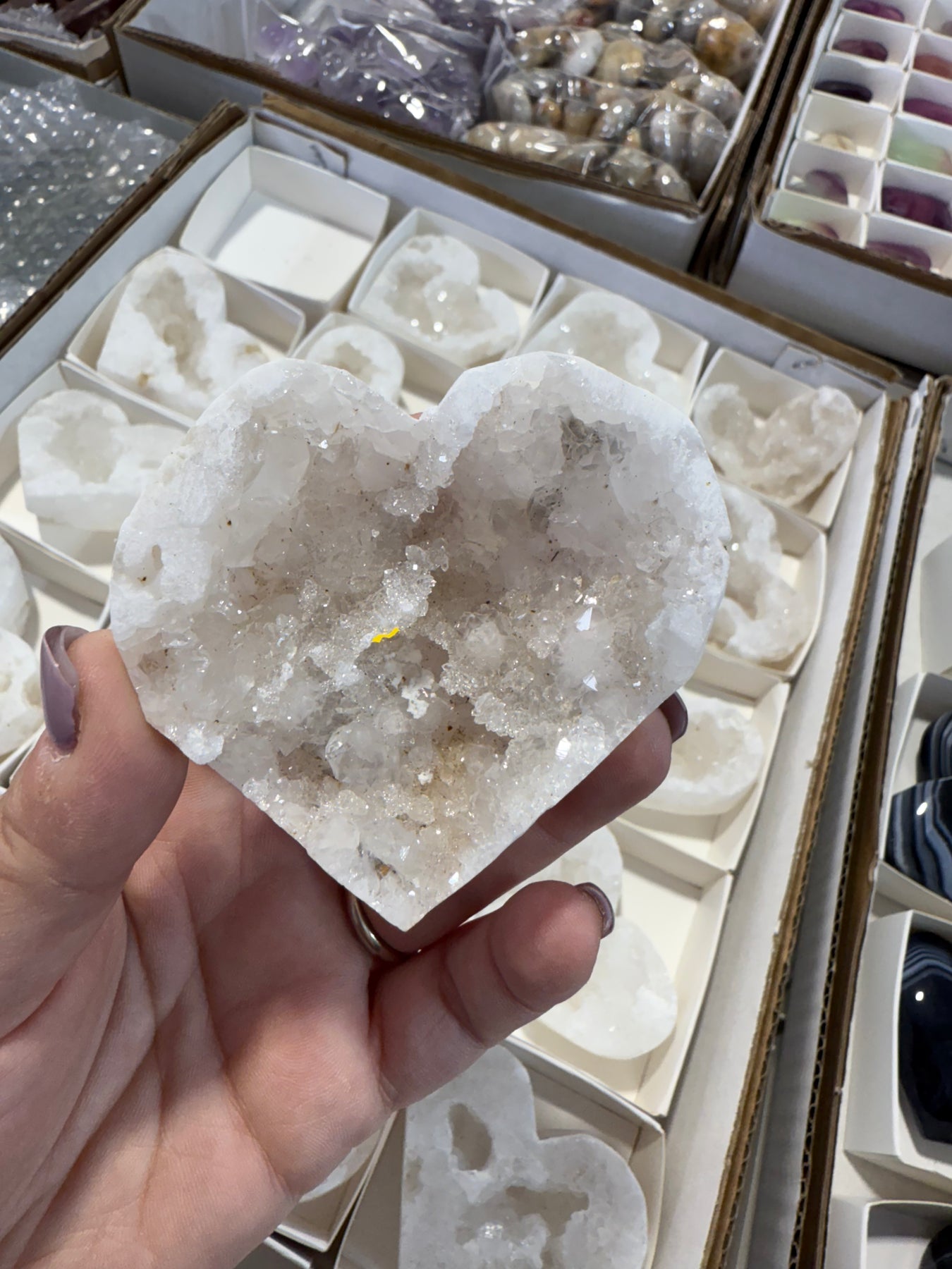 White Geode Hearts are also wonderful for cleansing and uplifting surrounding energy. Their naturally radiant structure helps reset the emotional field, creating a sense of calm presence wherever they are placed.